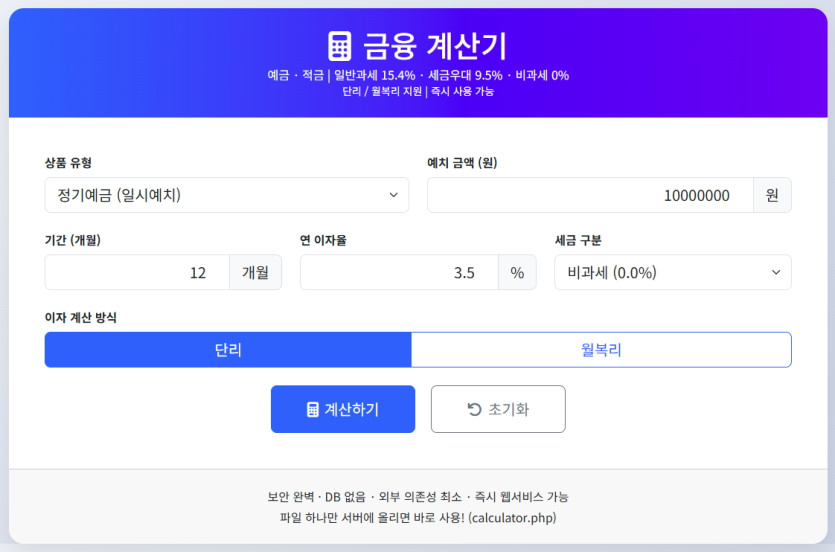 금융계산기 ( 예금 · 적금 | 일반과세 15.4% · 세금우대 9.5% · 비과세 0% 단리 / 월복리 지원 )